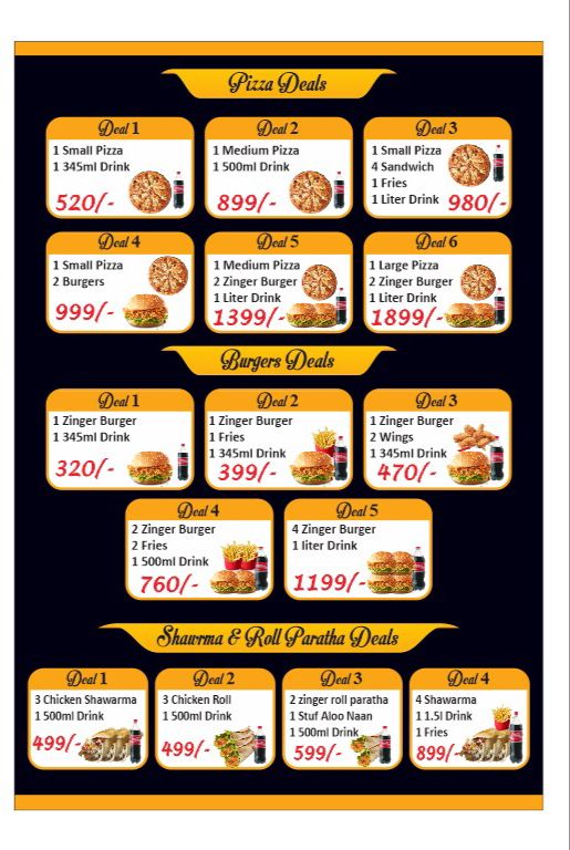 | Restaurant Type | FastFood Chinese Desi Pizza Coffee Steaks Dessert Beverage Pasta Roll Paratha |