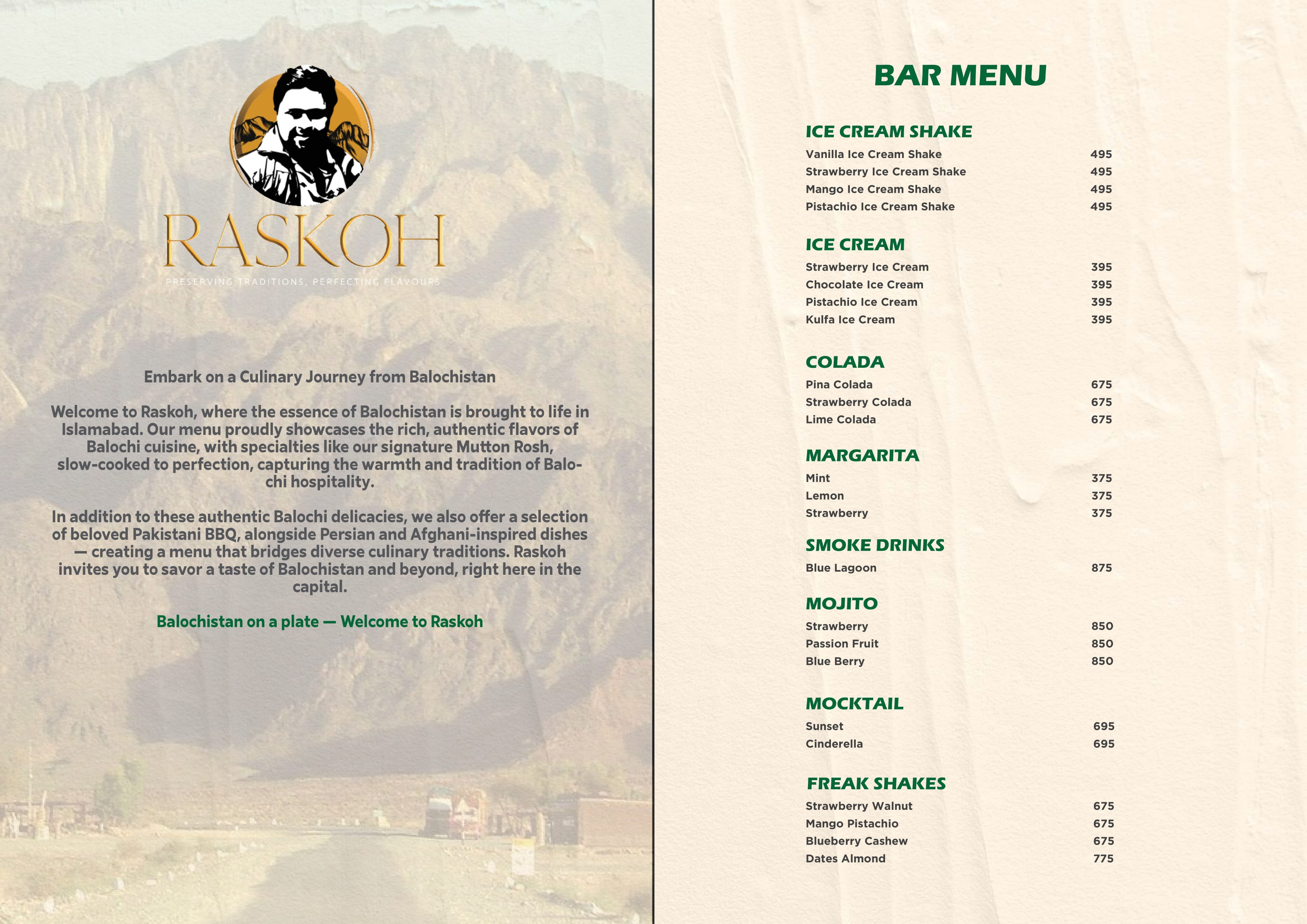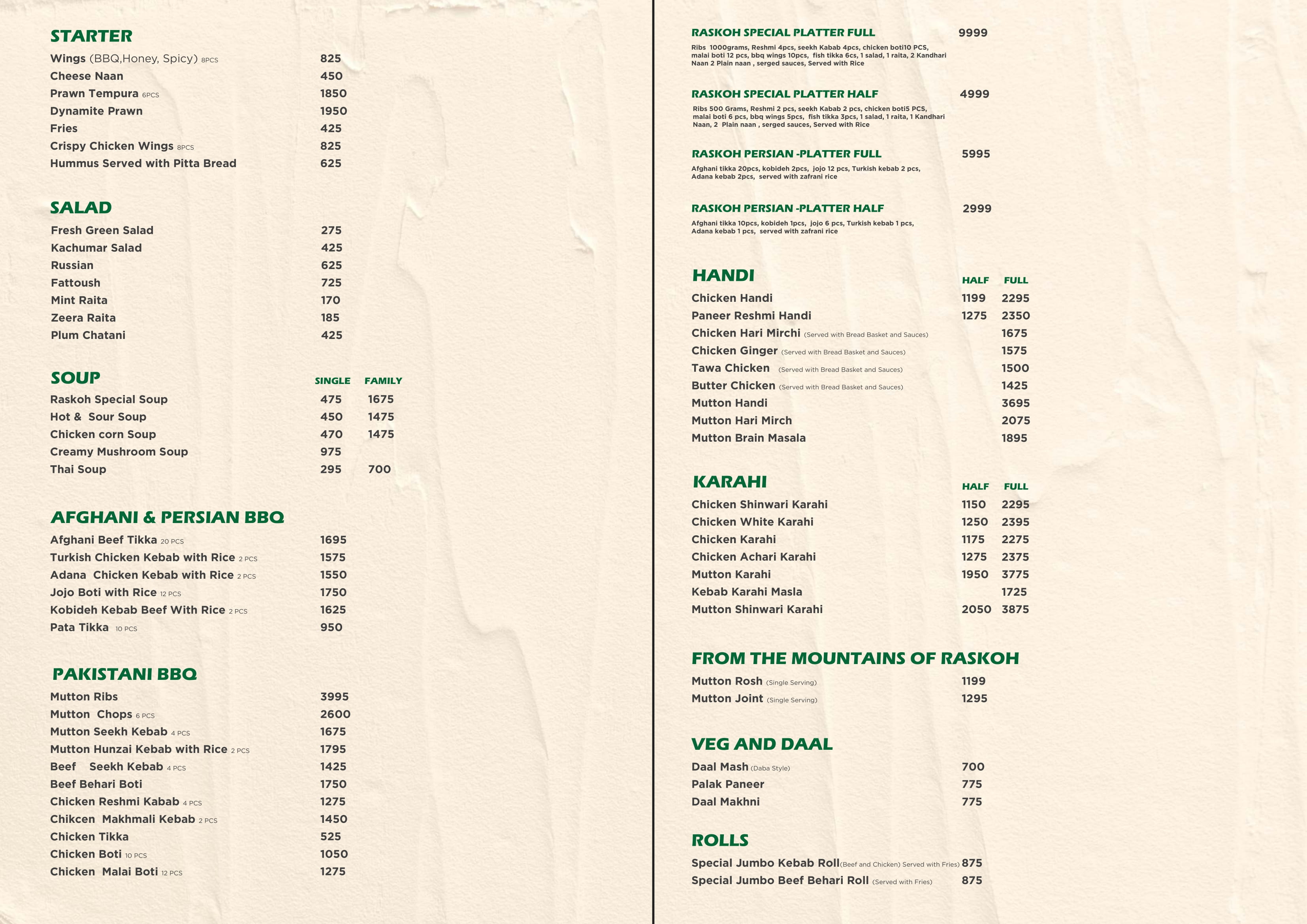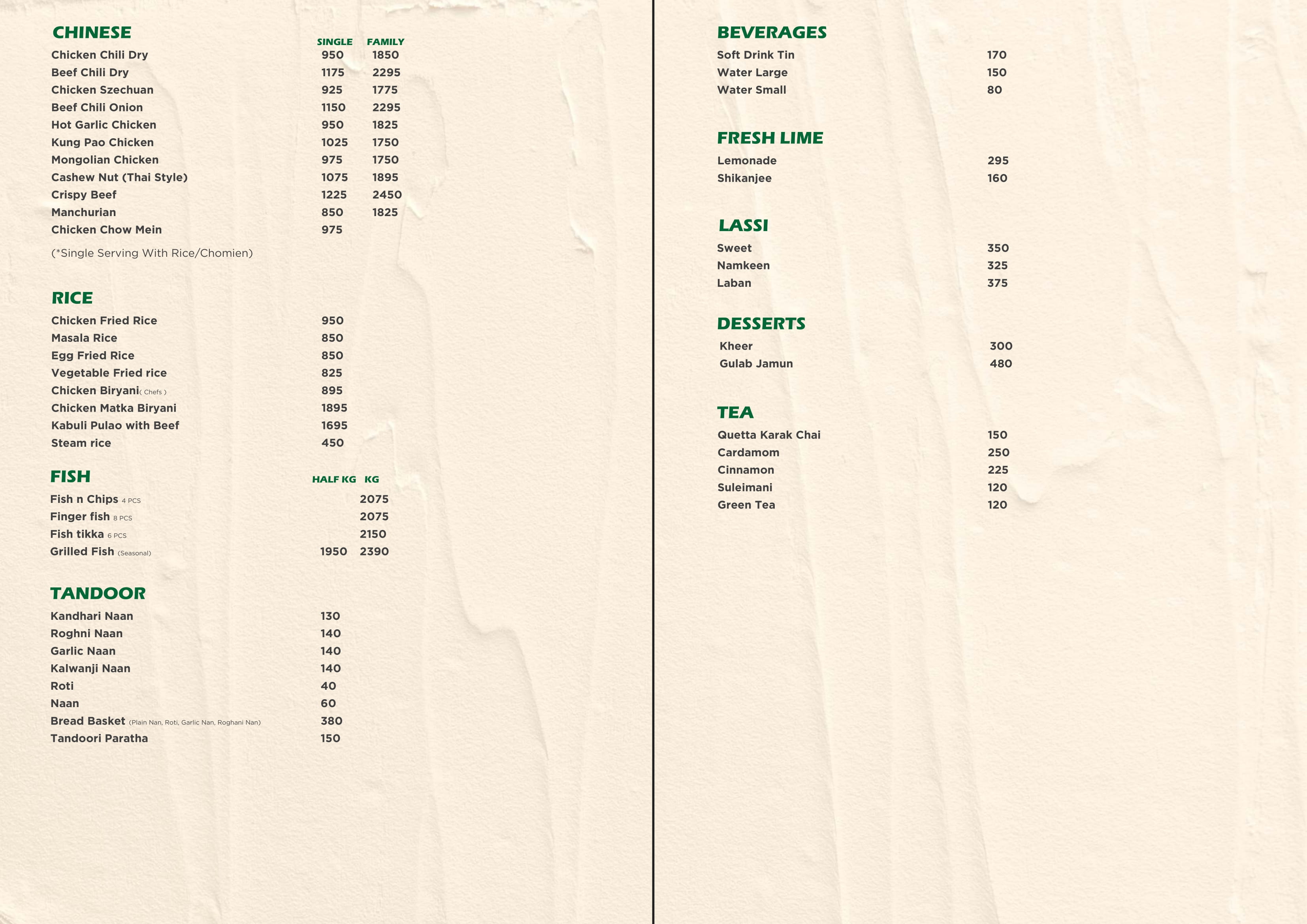| Restaurant Type | Chinese Desi Shinwari Biryani/Palao Turkish Dessert Beverage Roll Paratha Afghani |